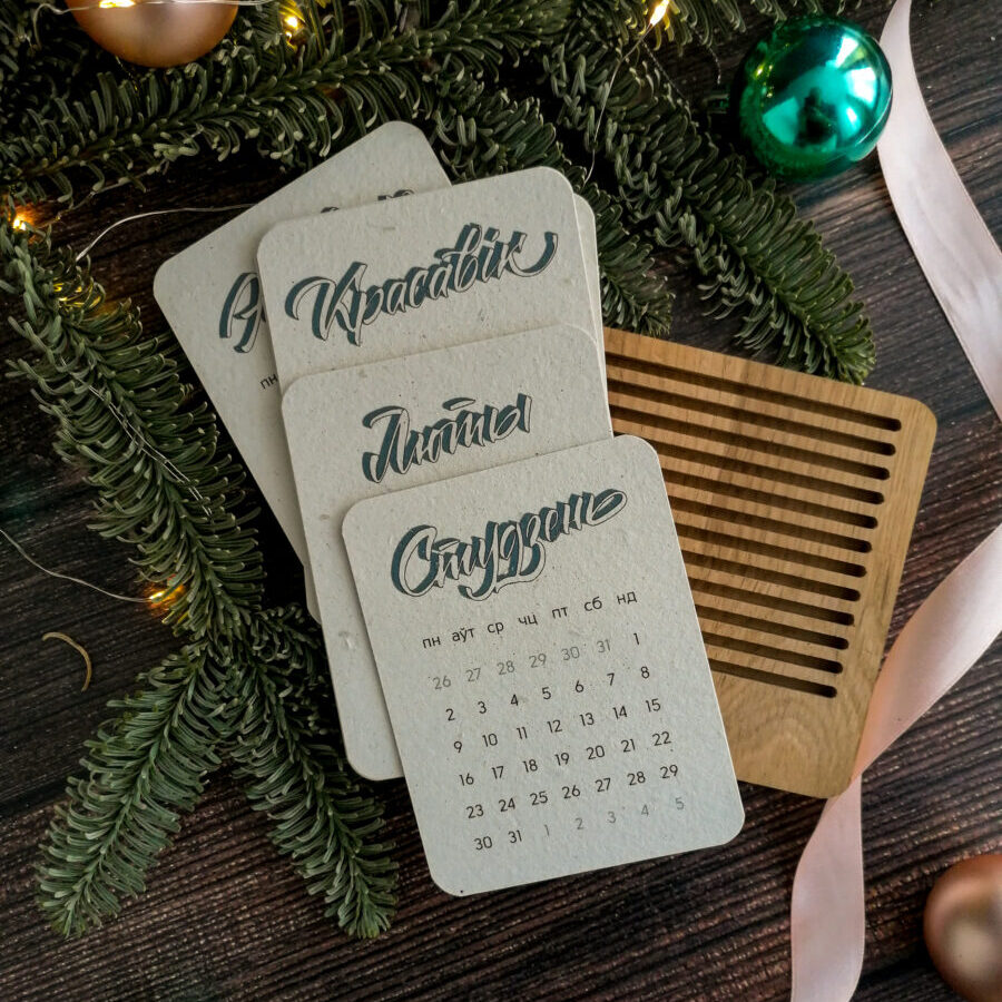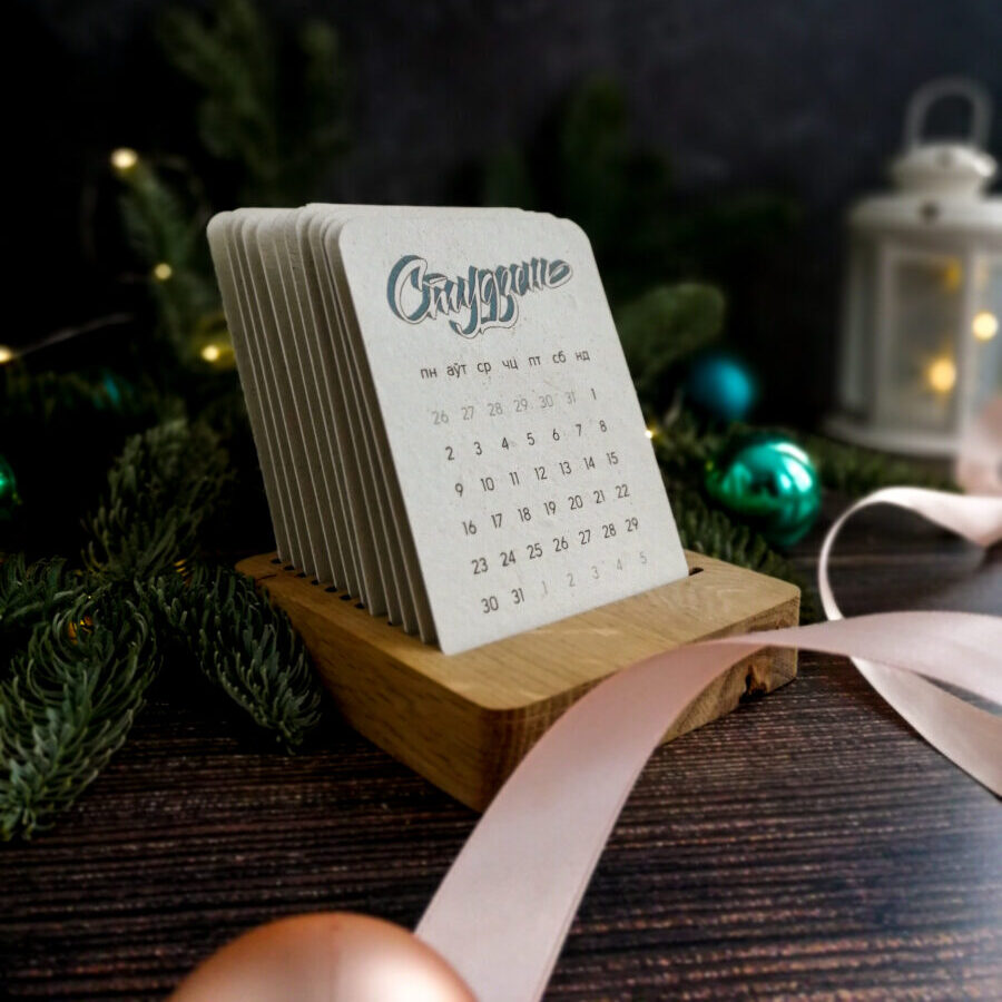 Яшчэ адзін цікавы настольны каляндар – дызайнерскі, з паперы ручнога ліцця і падстаўкі з дубу. У падстаўцы ёсць шчыліна для кожнага з 12 месяцаў. Замовіць можна наўпрост у майстэрні @papera.vera