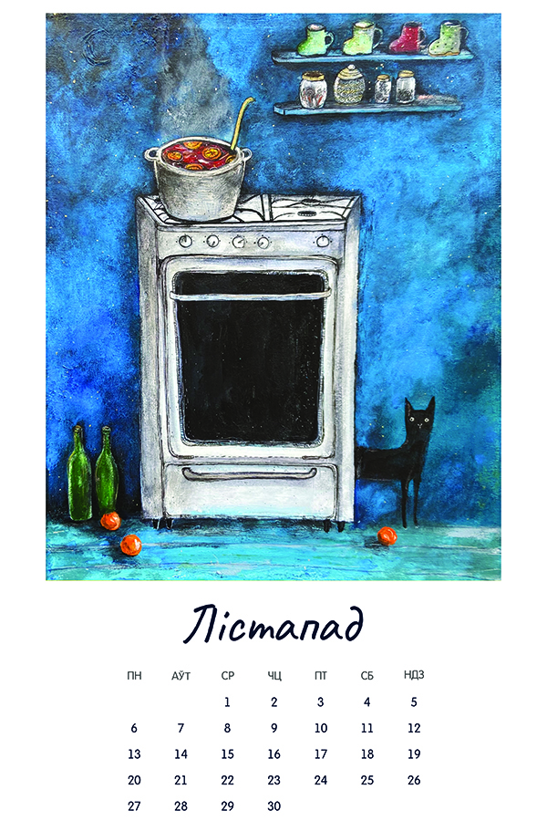 Каляндар ад беларускі з Ізраіля Дар’і Альперн-Каткоўскай можна ўмоўна назваць “Коцікі і кіты”. Карціны, якія ўпрыгожылі каляндар, можна доўга разглядць – столькі тут цікавых дэталяў і сэнсаў. Паспяшайцеся замовіць такі каляндар непасрэдна ў мастачкі праз гугл-форму.