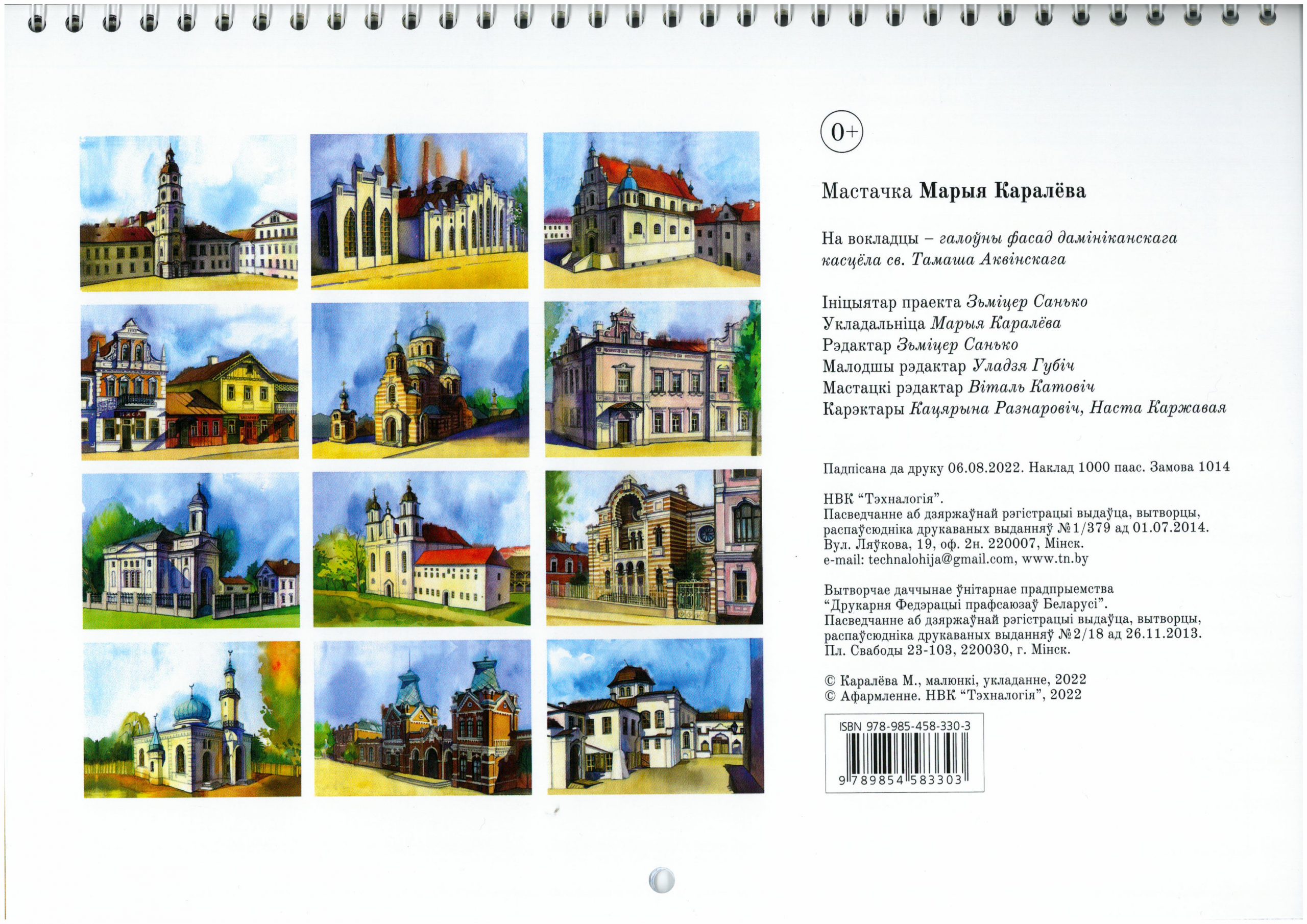Цудоўны каляндар з акварэлямі мастачкі Марыі Каралёвай @maryjkamam, малюнкі якой вы можаце памятаць з календара “Менск: горад і Сонца” на 2022 год і альбома “Вандроўкі-размалёўкі”, гэтым разам правядзе вас вуліцамі старога Менска, якімі мы самі ўжо не здолеем прайсці. На кожным разгароце календара – помнікі страчанай спадчыны горада і кароткае апісанне іх гісторыі. На ніжняй палове – зручны для планавання каляндар з буйной сеткай.