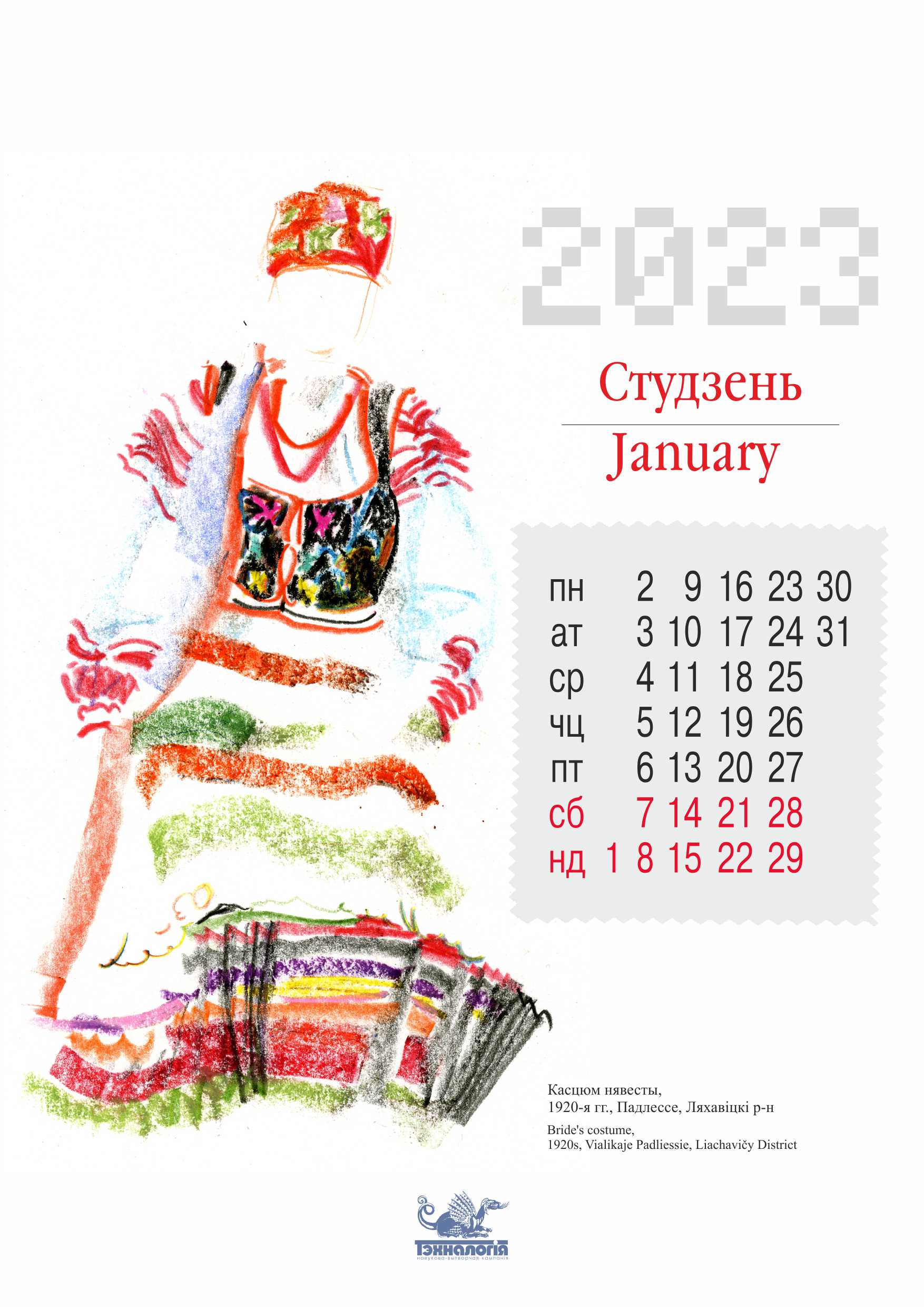 Каляндар на 2023 год з малюнкамі народных строяў мастачкі Вікторыі Багдановіч. У вас ёсць шанец кожны месяц вывучаць адметнасці беларускага народнага касцюма, атрымоўваючы асалоду праз хараство фактуры, колераў і арнаментаў. Мастачка адлюстравала іх у сваіх сшытках падчас экспедыцыі па Палессі і іншых мясцінах Беларусі. Чым гэта карысна і цікава? А хаця б тым, што, закахаўшыся ў беларускі народны строй, Кандзінскі вынайшаў… абстрактны жывапіс!