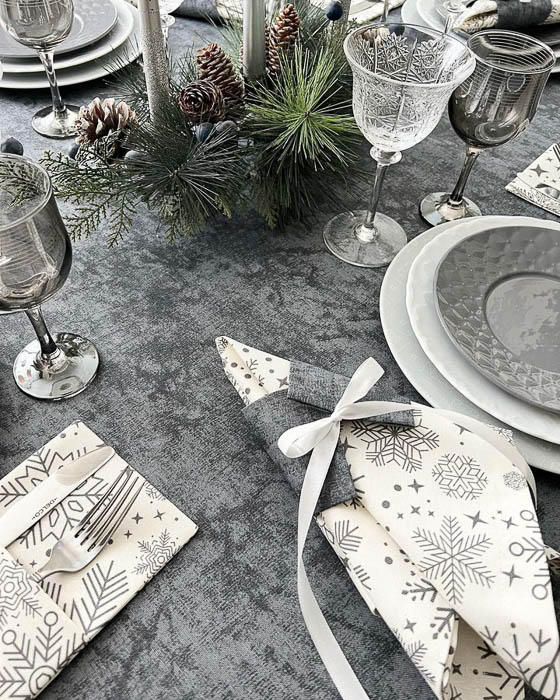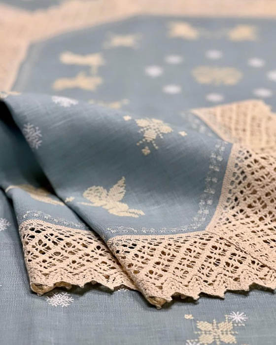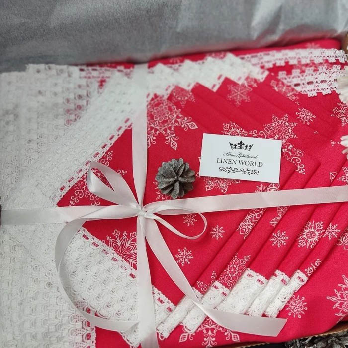 Калядны і навагодні стол мусіць быць не толькі смачным, але і прыгожым. Абрусы, дарожкі, сурвэткі з ўімовымі матывамі могуць паслужыць і дэкорам, і цудоўным падарункам маме, бабулі ці калегам. А пледы, падушкі ды іншы тэкстыль з каляднымі матывамі дадасць утульнасці і цяпла ў час сустрэчы з блізкімі.
