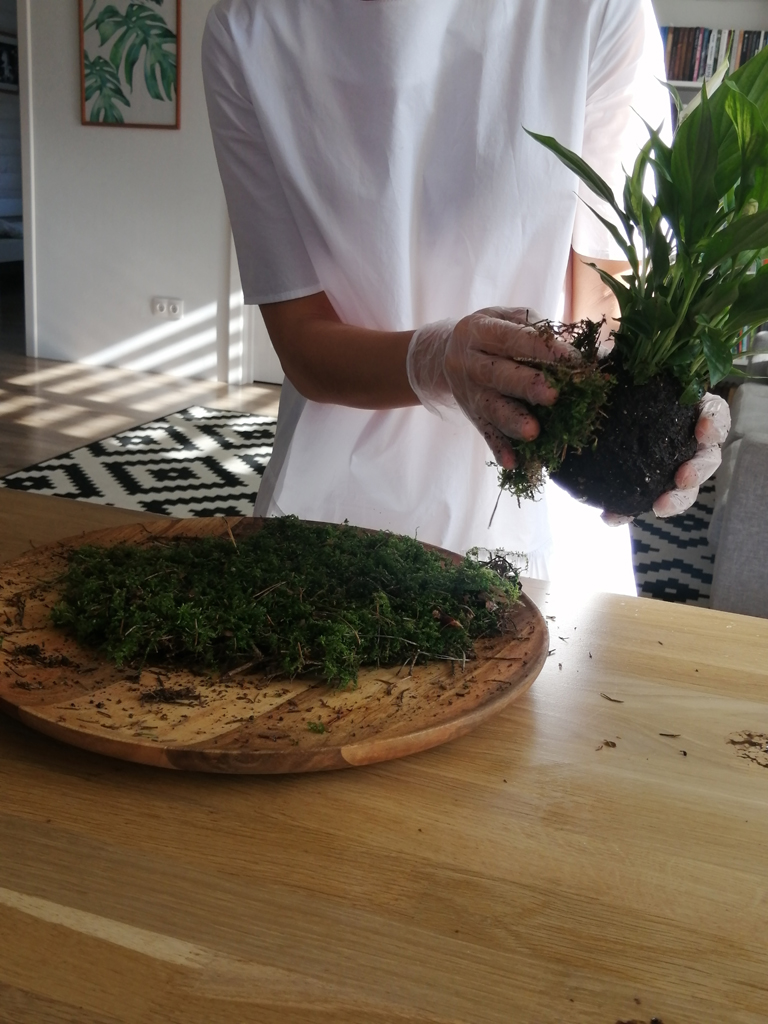 Падрыхтуйце грунт для стварэння землянога кома. Грунт лепш браць падыходзячы для канкрэтнай расліны і перад пачаткам працы яго неабходна добра ўвільгатніць. Мох таксама раскладзіце на роўнай паверхні і шчодра спырсніце вадой. Для працы падыходзіць звычайны лясны мох, які можна самастойна сабраць у хваевым лесе.