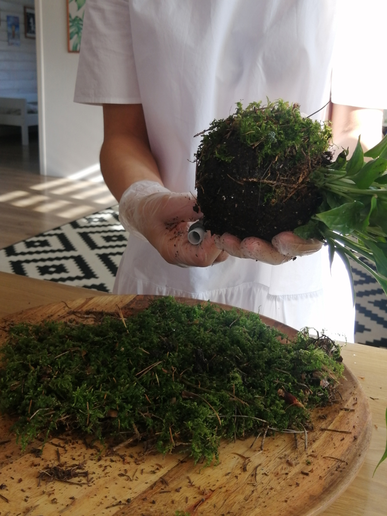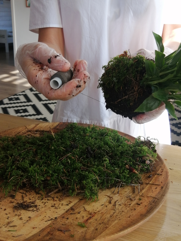Калі земляны шар зроблены, вазьміце невялікі кавалачак моху і пачынайце абкладаць ім зямлю. Прыкладаючы кожны кавалак моху, абкручвайце вакол шара баваўняную нітку, каб зафіксаваць мох і падтрымаць форму какедамы.