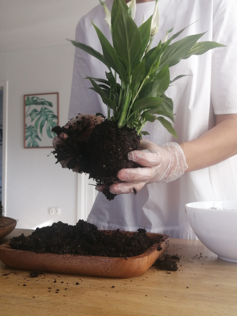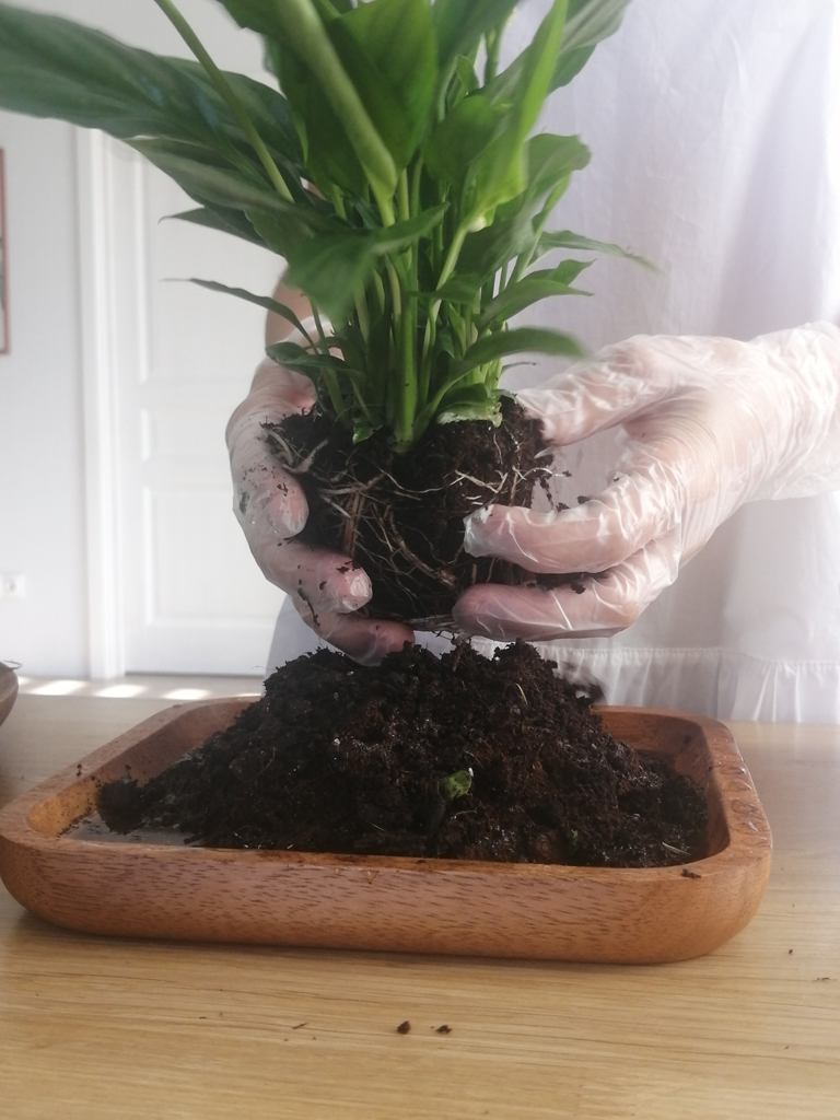 Акуратна, стараючыся не пашкодзіць карані, дастаньце раслінку з кантэйнера або гаршчочка. Прыбярыце лішні грунт з карэньчыкаў. Не трэба разбіраць усе карані, няхай яны трымаюць сваю форму, прыбірайце толькі тое, что само паддаецца пры дотыку.
