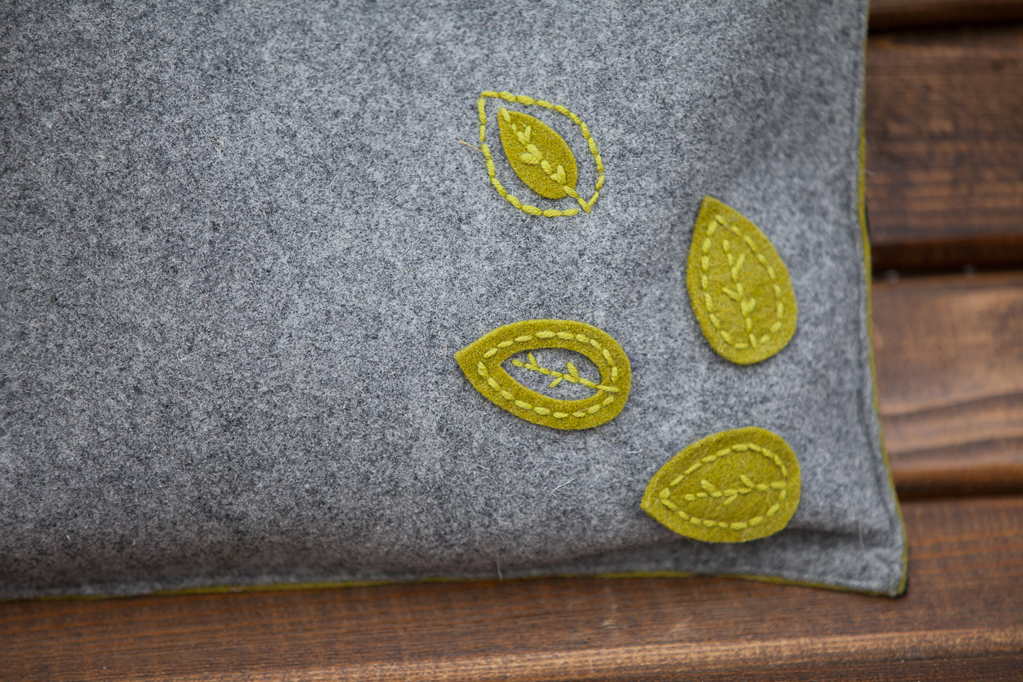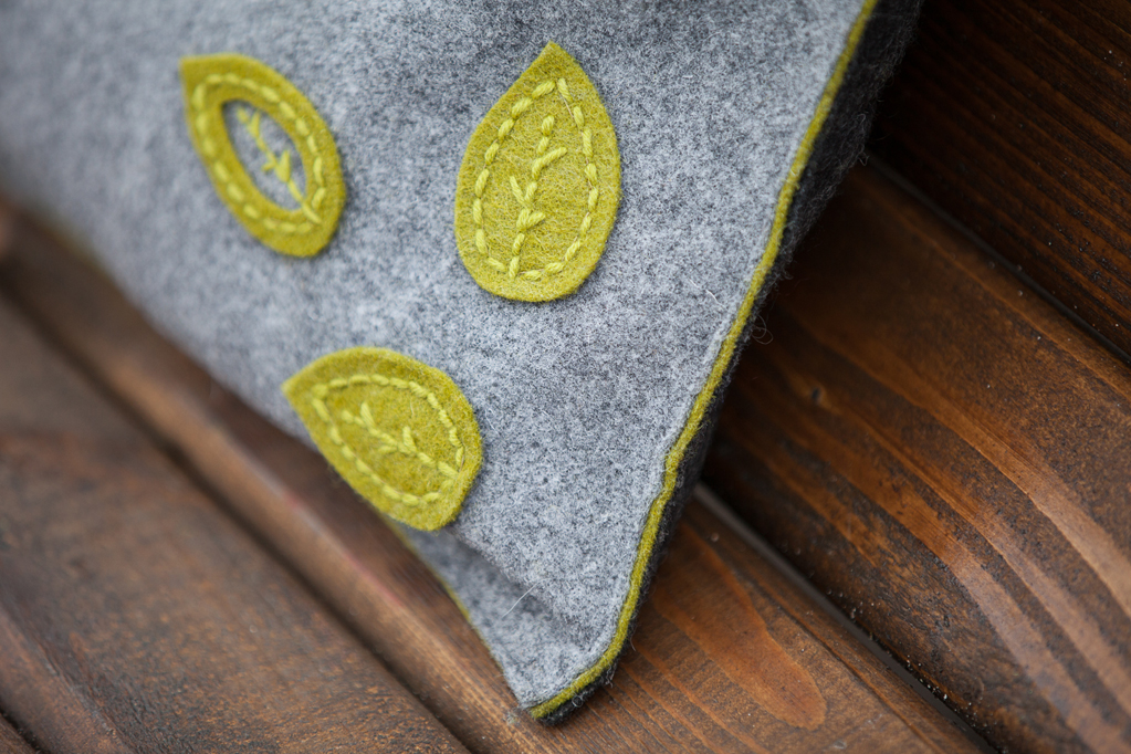 - Да дэталі з шэрага фетру прышыць дэкор з фетру аліўкавага колеру, другую частку стужкі-ліпучкі для засцежкі.