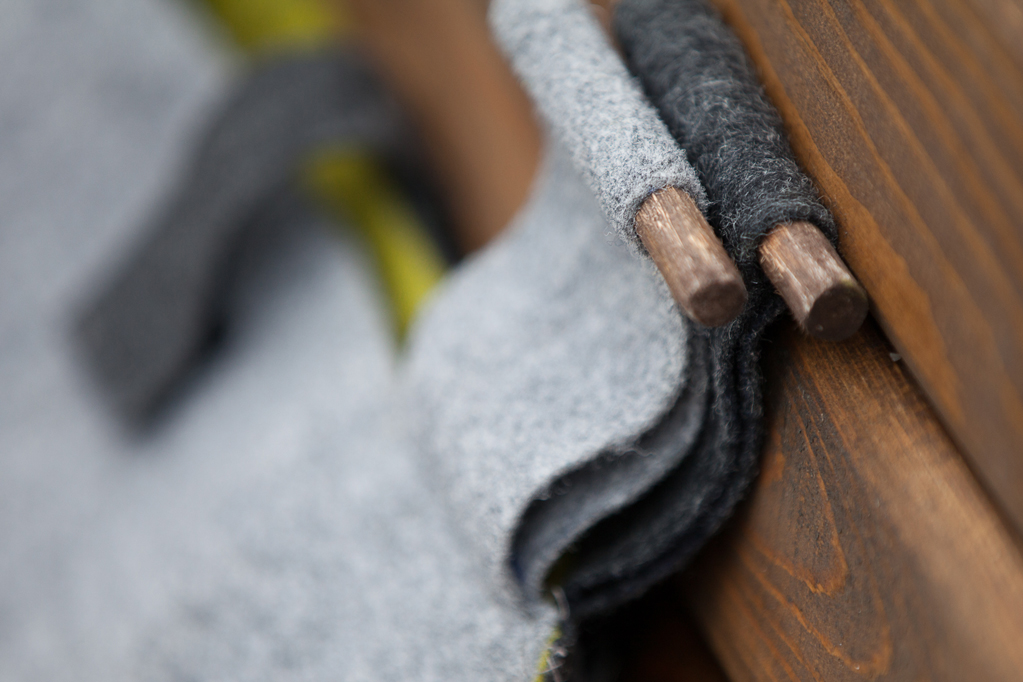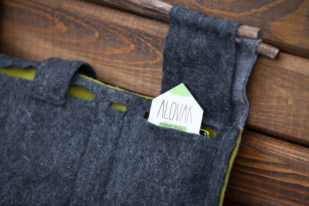 Матэрыялы, якія спатрэбяцца: 1 ліст фетру шэрага колеру (4940); 1 ліст фетру цёмна-шэрага колеру (4940); 1 ліст фетру аліўкавага колеру (36*24); шэрыя ніткі для шыцця; рэшткі нітак для вязання фісташкавага колеру (салатавага); 4 см стужкі-ліпучкі Velcro; падыходнага памеру галінкі для ручак.