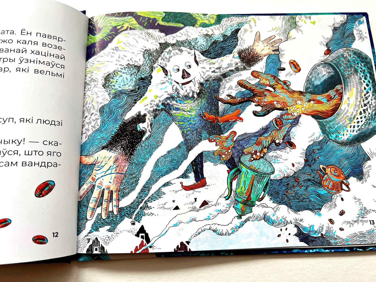 Дык як жа мастаку прыдумаць візуальныя вобразы для казкі? Як стварыць персанажаў, асяроддзе і казачную атмасферу? Мала проста прачытаць казку, убачыўшы “карцінкі” ў сваім уяўленні, неабходна яшчэ перавесці сваё ўражанне на графічную мову, мову кропак і ліній, колеры і фактуры. А працэс гэты працяглы, але вельмі займальны.
