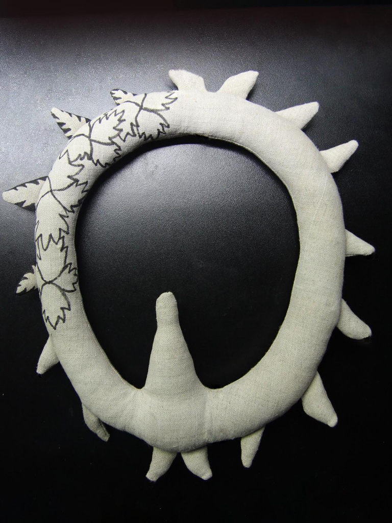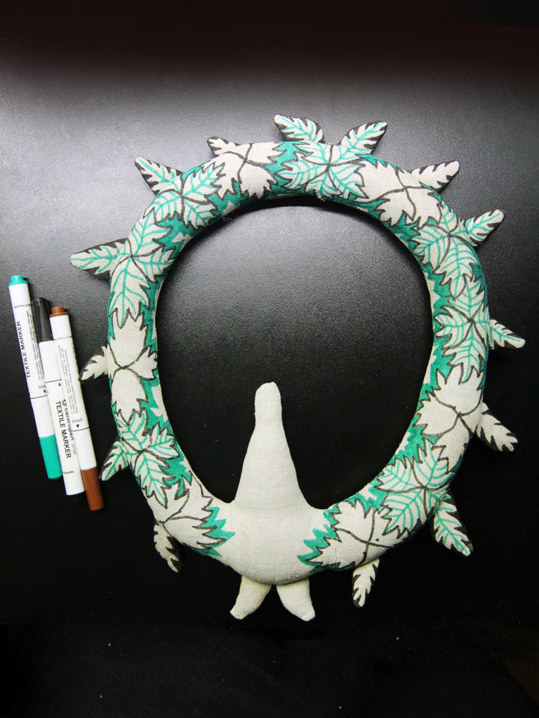 Выварочваем вянок на вонкавы бок, набіваем шчыльна сінтэпонам і пачынаем размалёўваць яго маркерамі па тканіне.