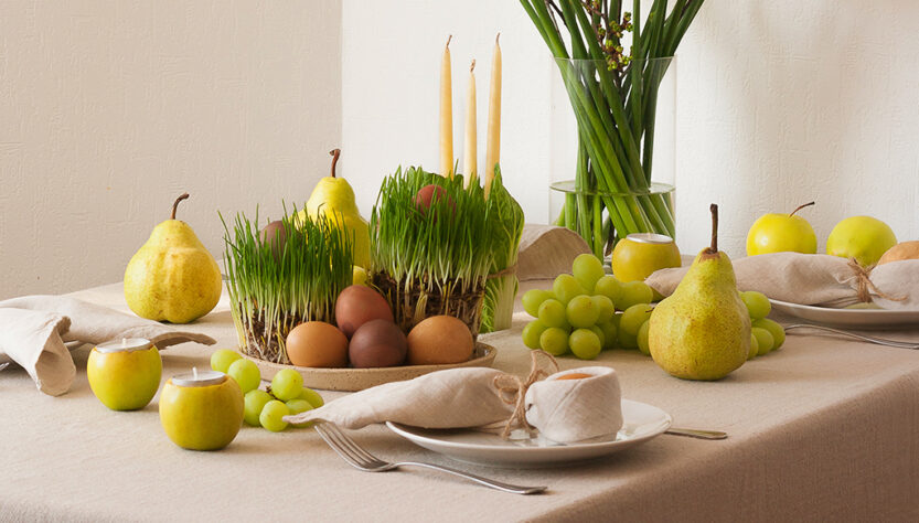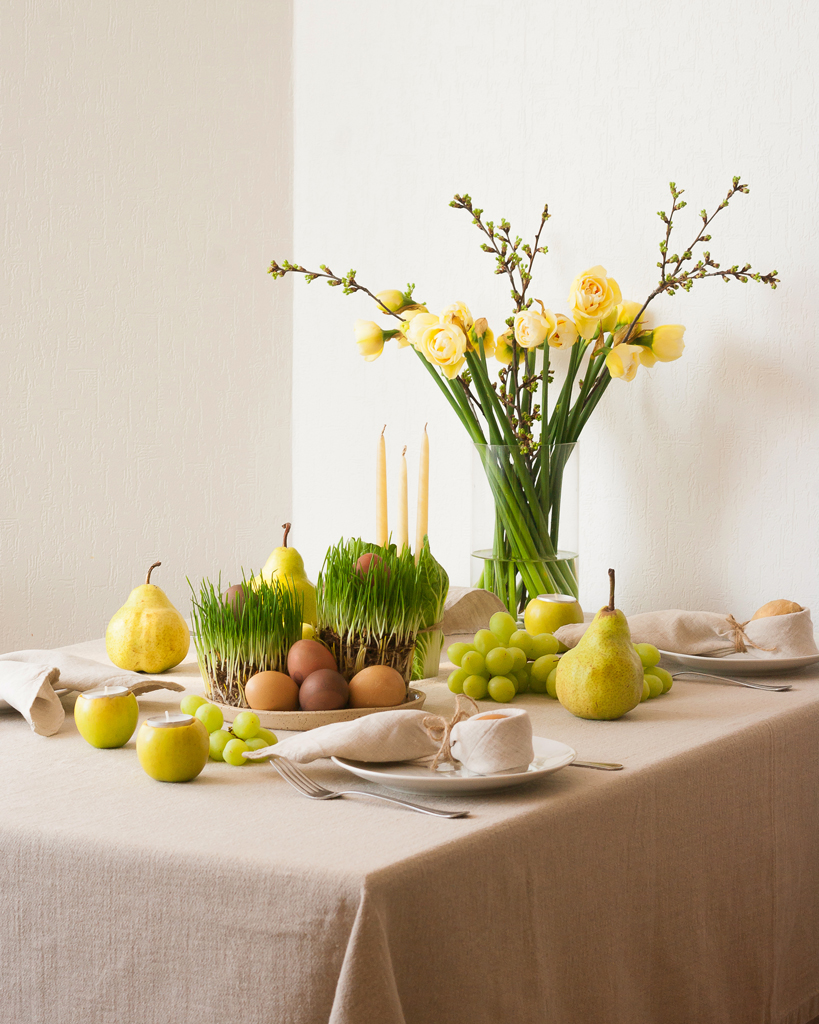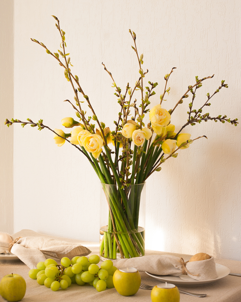Поддержать цветовой акцент нам помогли доступные натуральные материалы, овощи и фрукты разных оттенков зеленого: яблоки, груши, виноград, листья капусты, проросшая трава и ветки деревьев. Зеленые стебли нарциссов также поддержали цветовой акцент – их желтоватые головки также прекрасно вписались в цветовую гамму сервировки.