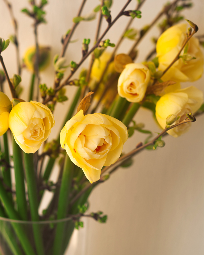 Использование цветущих веток в букетах с весенними цветами — настоящий тренд во флористике! И согласитесь, это очень красиво. Кроме того, ветки деревьев сохраняют свою привлекательность дольше, чем многие срезанные цветы, особенно при правильном уходе. Можно использовать ветки плодовых деревьев (вишни, черешни), ивы или любого другого дерева или кустарника.