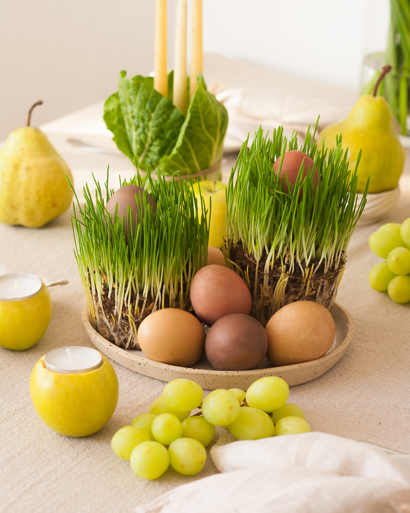 В качестве подставки для яиц мы взяли довольно широкую тарелку и украсили ее настоящей травой. Вы можете прорастить его самостоятельно, но сделать это нужно заранее, как минимум за 2 недели до Пасхи. Для прорастания подойдут семена газонной травы или злаковых культур (например, пшеницы или овса). А в зоомагазинах можно купить уже готовую пророщенную траву.