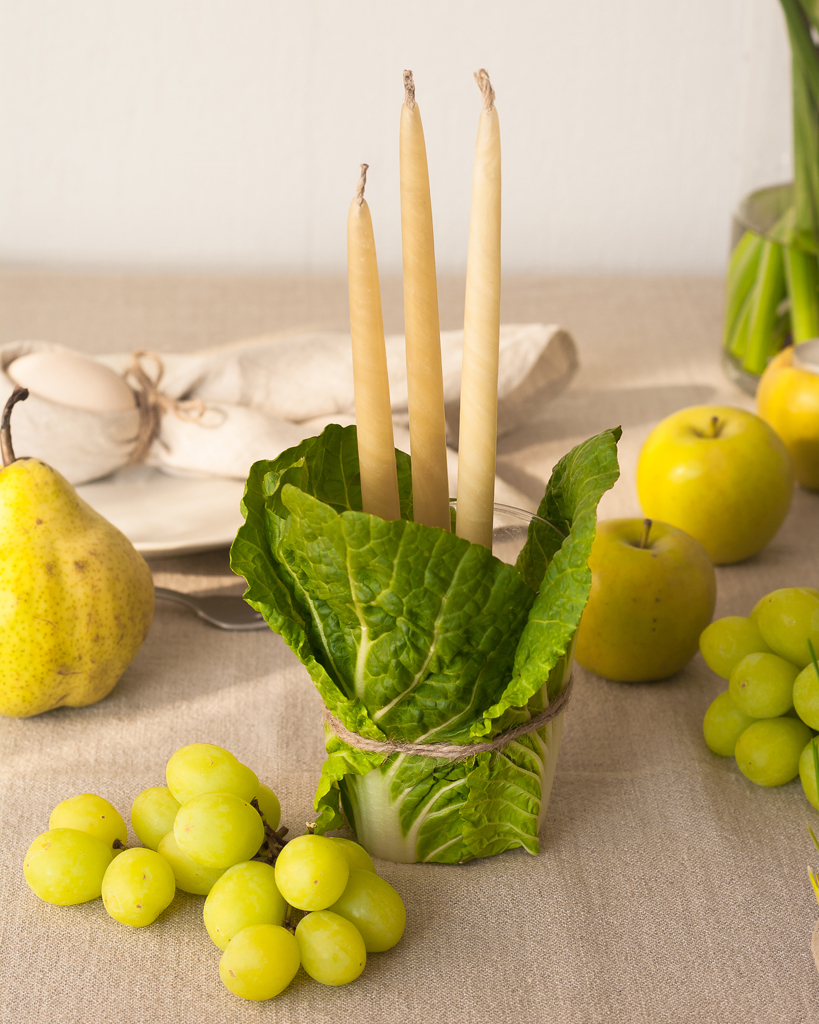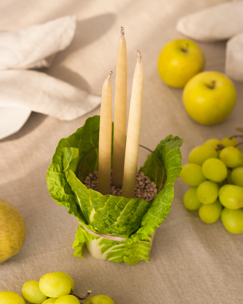 В нашем случае ваза стала подсвечником для высоких настольных свечей, но цветы тоже смотрелись бы в ней хорошо! Все очень просто – оберните любой стакан или банку капустными листьями (количество зависит от размера стакана и самих листьев), обвяжите несколько раз шпагатом и завяжите аккуратный бант. Обязательно выбирайте целые листья капусты — для этого может потребоваться удалить по крайней мере несколько верхних листьев. Подойдет пекинская или ранняя обычная капуста — в декоративных целях лучше выбирать более зеленые кочаны.