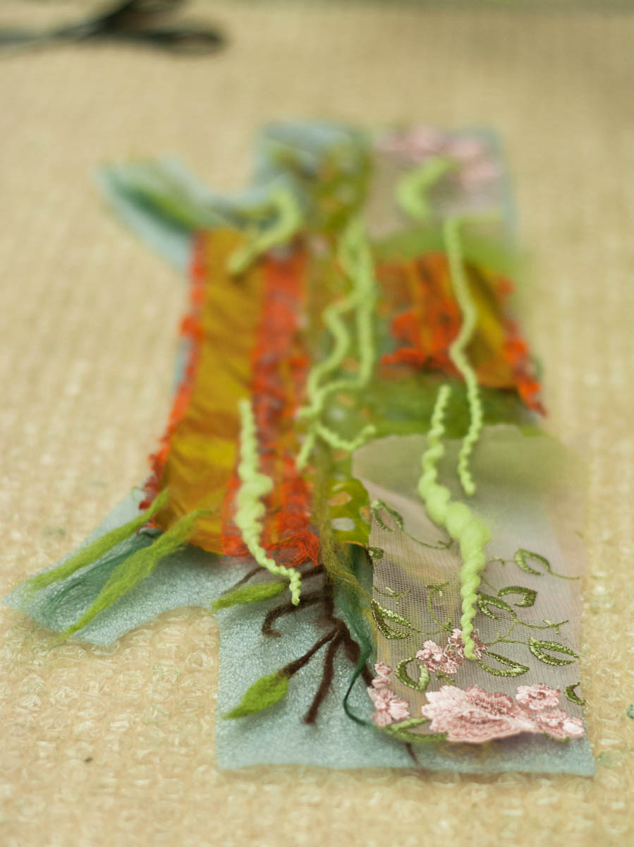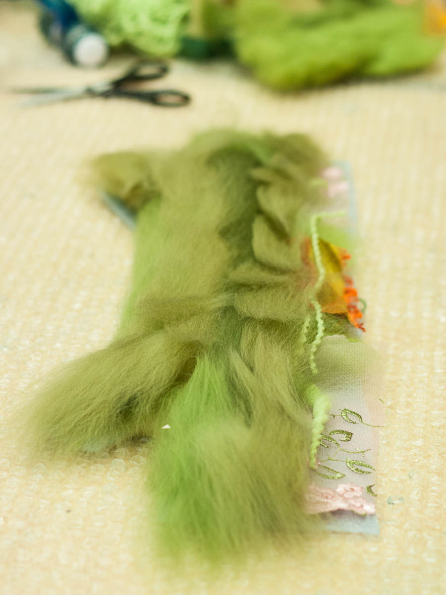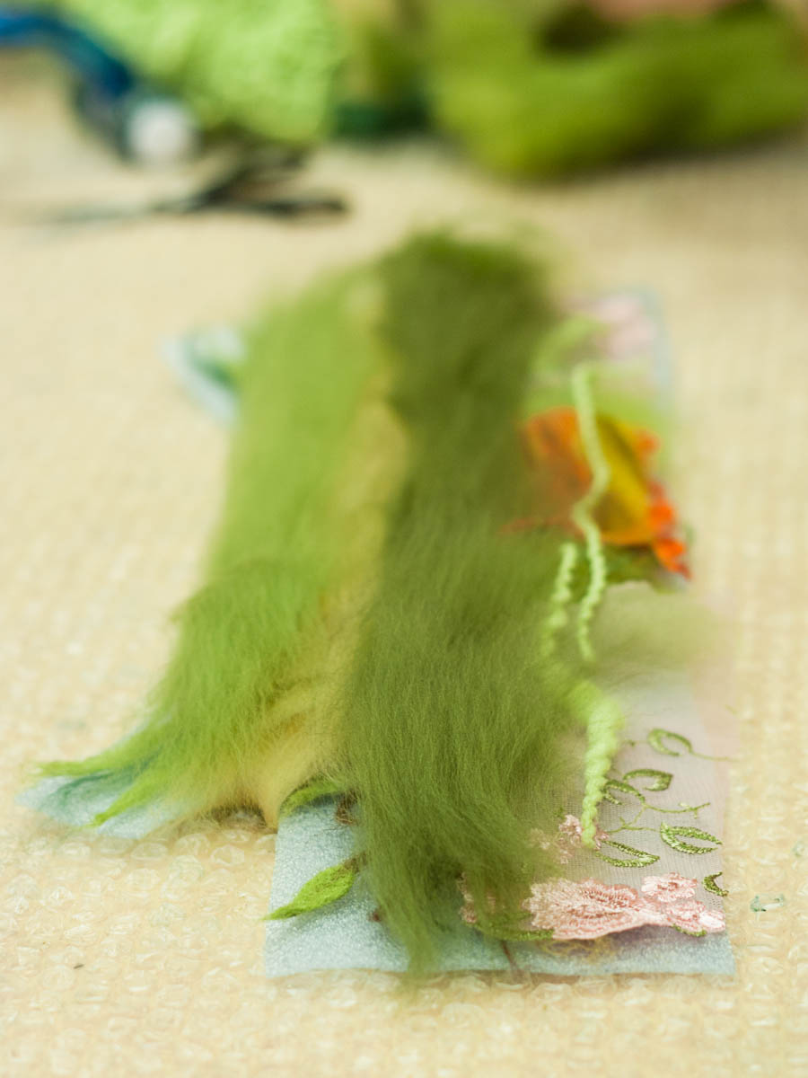С Ольгой мы договорились, что валять будем митенки. Мы пришли на занятие и сразу же приступили к делу – благо Ольга подготовила все необходимые материалы и инструменты (для новичков она так делает всегда). Оказалось, что материалом для войлочных изделий, кроме непосредственно шерсти, может служить практически всё что угодно: обрезки натуральных тканей, кружево, волокна вискозы, шелка, льна, конопли, молочного протеина, сои, пряжа для вязания… Главное, чтобы такой декор хорошо приваливался к шерсти. Вот уж где простор для фантазии!