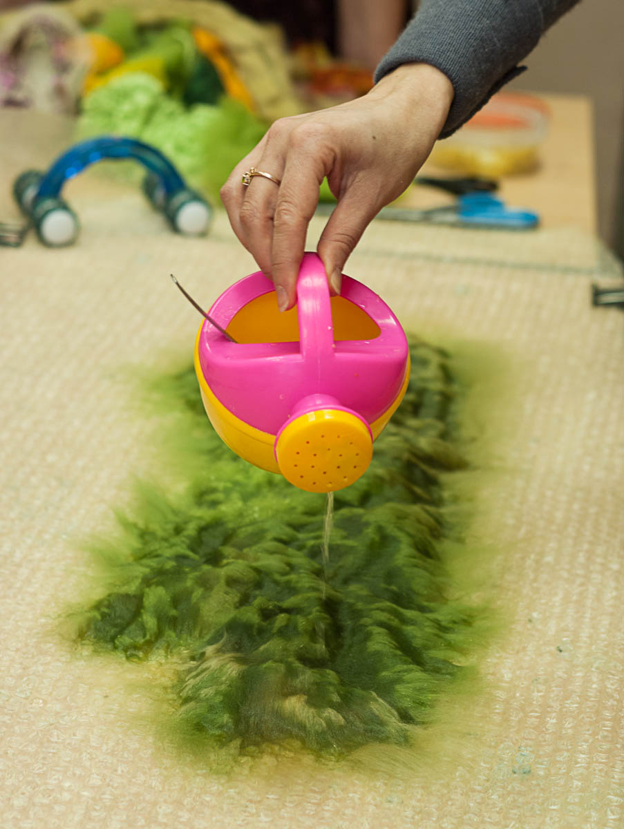«Если шерсть где-то плохо намокнет – то при валянии в этом месте может образоваться дырка. Но и излишняя вода может навредить изделию. Поэтому под руками всегда должна быть салфетка, ткань или полотенце».
