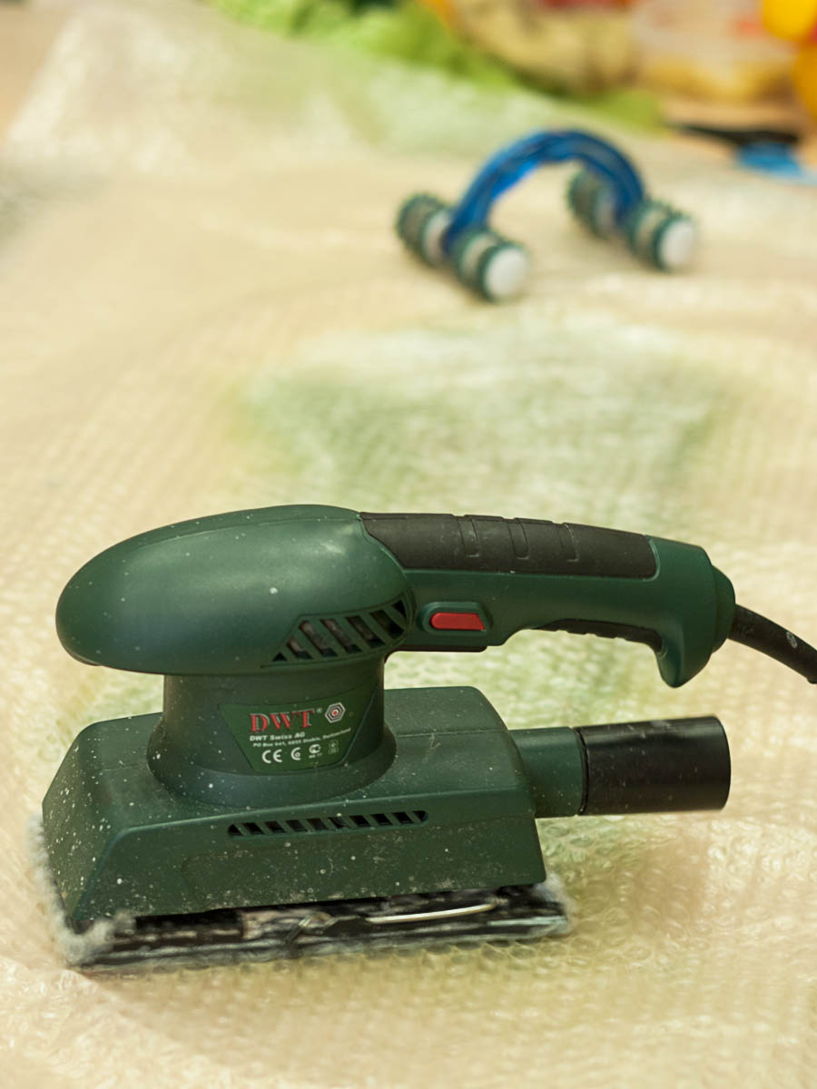 Все дальнейшие этапы – стандартные для техники мокрого валяния из шерсти. Мы смочили разложенную шерсть мыльным раствором, а затем прокатали массажером по накрытой пупырчатой пленкой шерсти. Но можно использовать и более современные девайсы, так же как и инструменты, изначально не предусмотренные для валяния. Например, виброшлифовальная машинка.