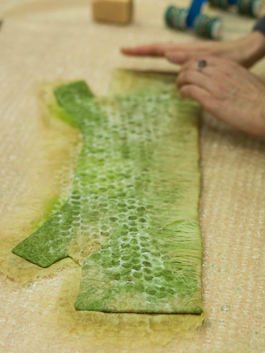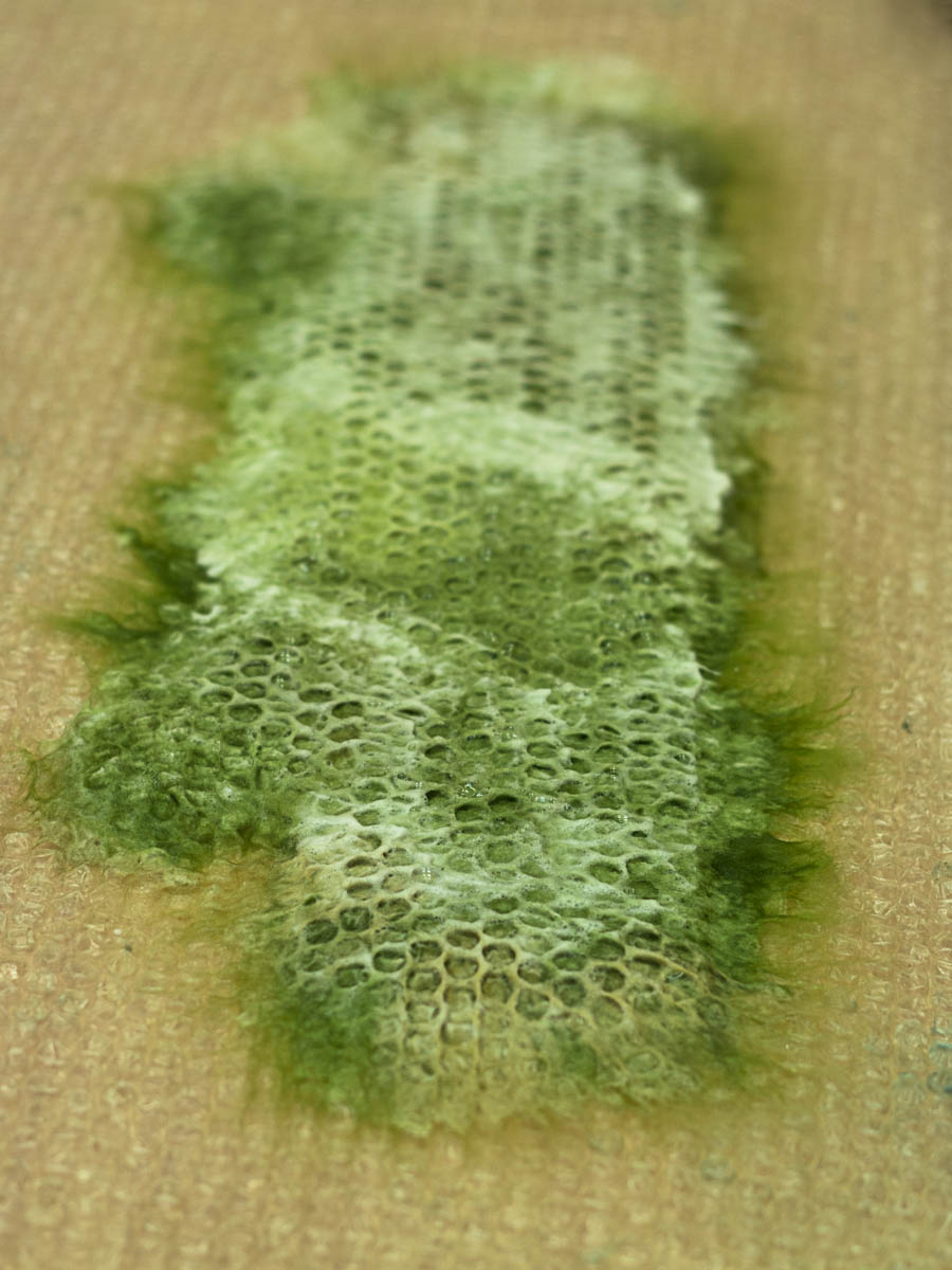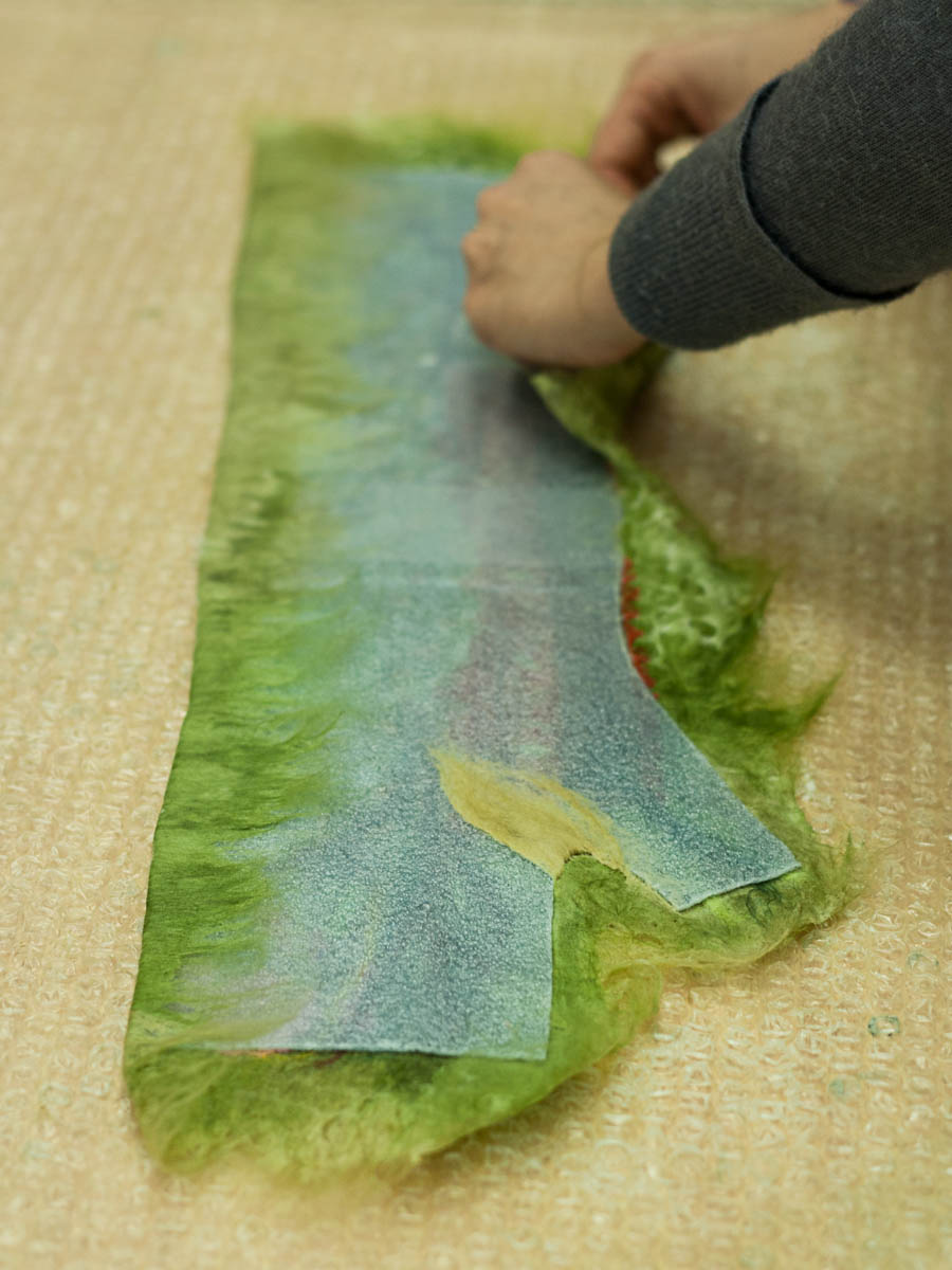После валяния и жужжания машинки пришло время снимать пленку. Нам хотелось скорее заглянуть под слой шерсти и посмотреть, что же получилось, но пришлось набраться терпения и продолжить работу. С обратной стороной шаблона мы сделали всё то же самое, что и с предыдущей: желаемый декор – раскладка шерсти – мыльный раствор – валяние.