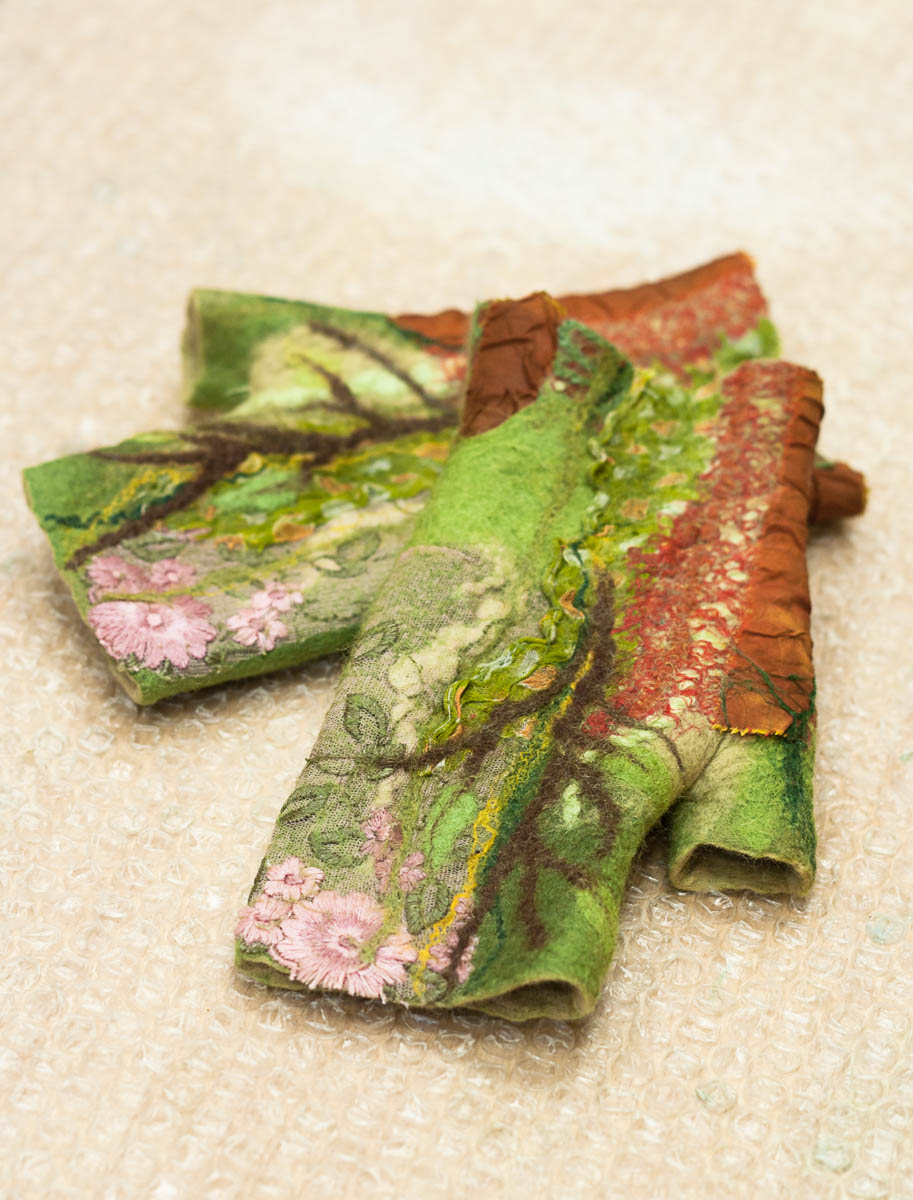 После раскладки и валяния второй стороны митенок самое время поработать руками – это занятие для терпеливых. Нам потребовалось около часа, пока мы не почувствовали, что шаблону стало тесно внутри митенок. И только после этого Ольга разрешила разрезать шаблон на две части. Но и это еще не всё! Мы вывернули митенки на лицевую сторону, ахнули от увиденной красоты и продолжили валяние на колодке, которой в данном случае были наши руки.