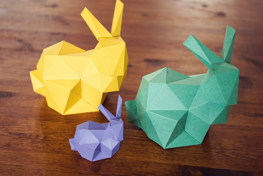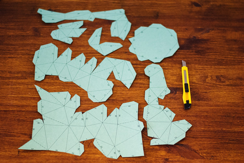 5. Как можно заметить, на каждой грани модели нашего будущего зайца стоит номер. Находим одинаковые номера на каждой бумажной детали модели и склеиваем соответствующие грани между собой. Склеивать нужно от самых маленьких треугольников (полигонов) до самых больших.