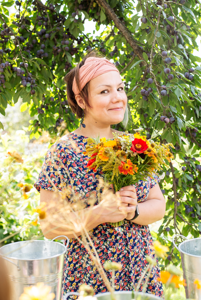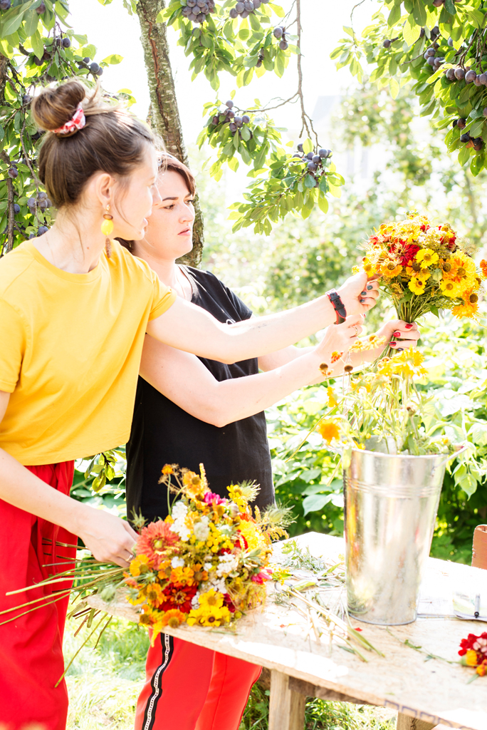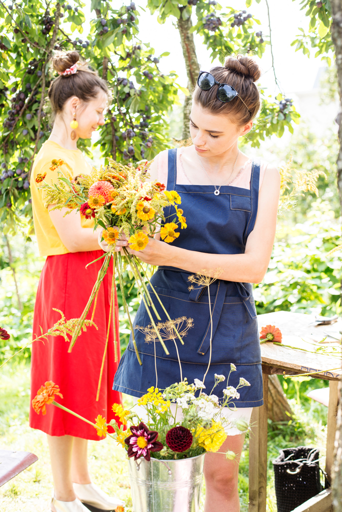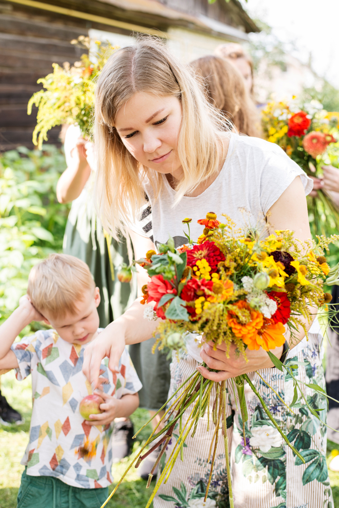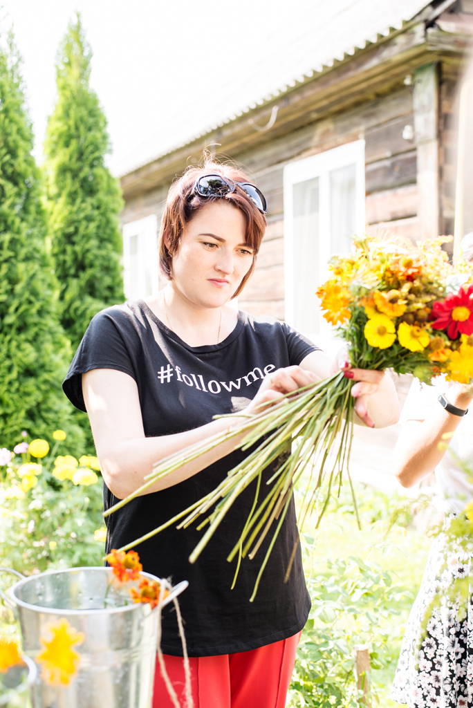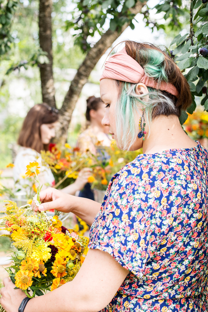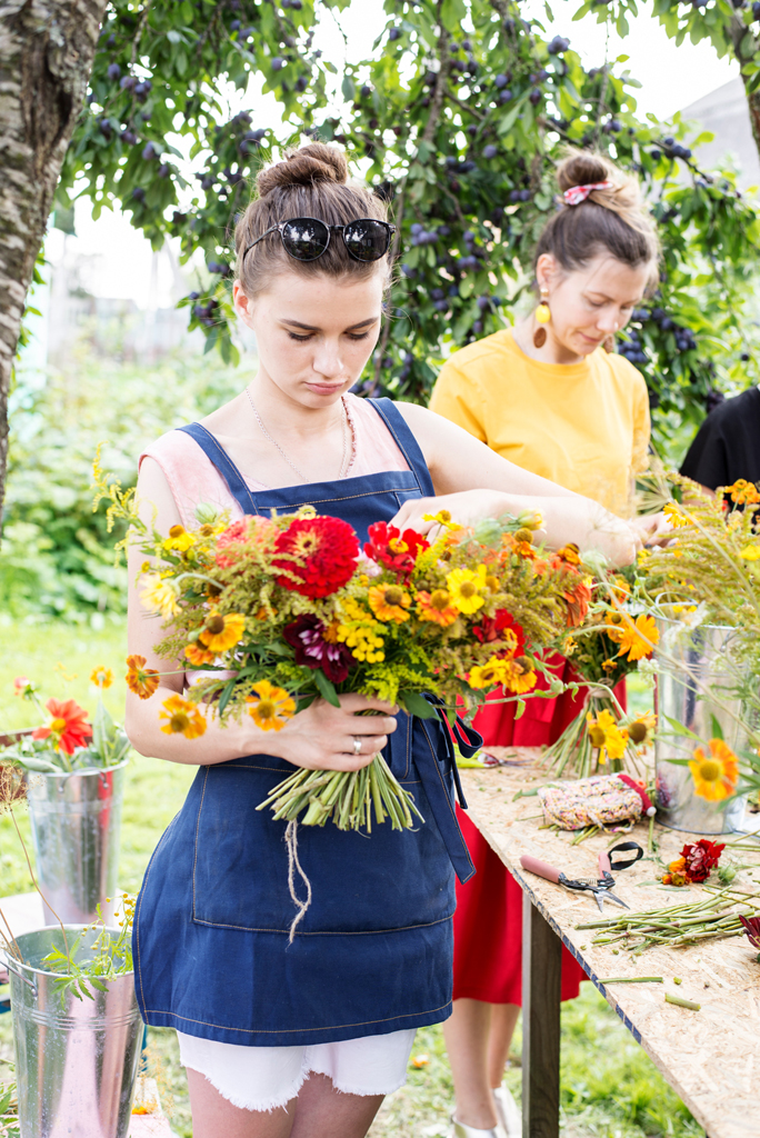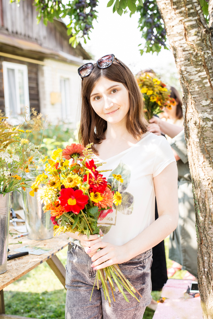 Сытые, довольные и полные сил, мы вернулись в сад – следующей частью нашей встречи стал мастер-класс от Екатерины по созданию букета из сезонных садовых и полевых цветов. Начали с теории – наш преподаватель рассказала о тонкостях срезки и подготовки стеблей, о базовых правилах сборки букета.