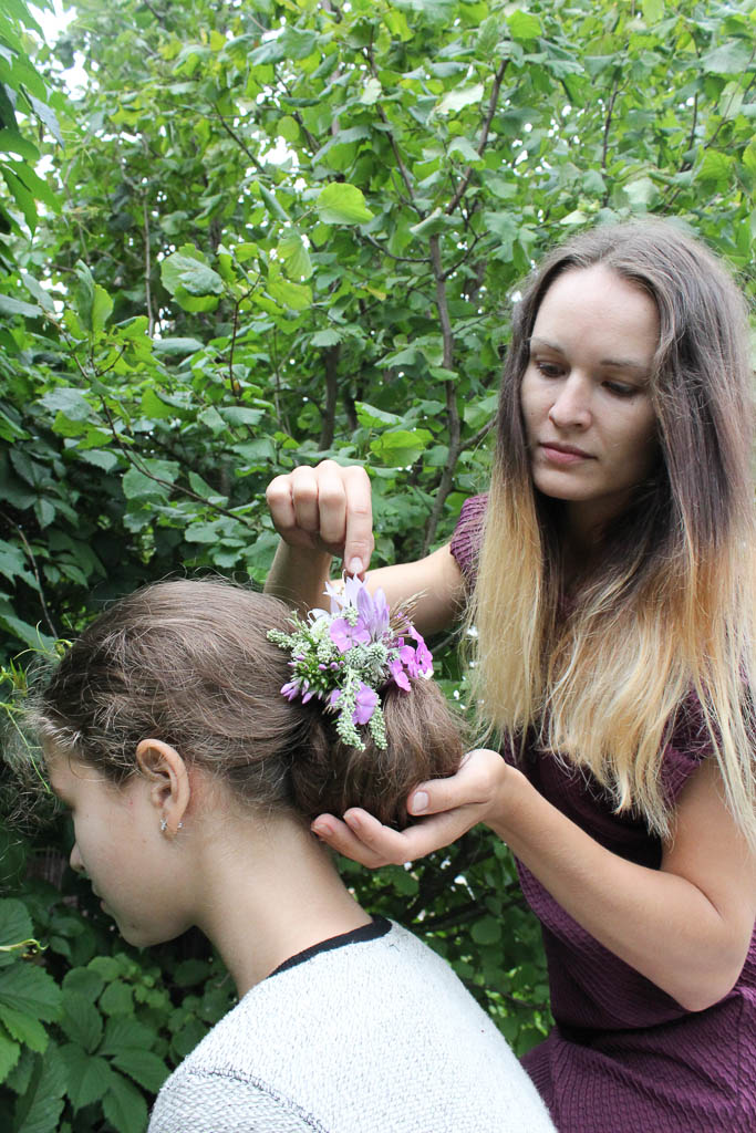 Чередуйте разные фактуры, размеры бутонов и цвета, поиграйте формами – именно это определит будущий вид заколки. Я люблю, когда работу нужно рассматривать, когда взгляду есть на чем остановиться. Поэтому использовала несколько видов цветов и растений.