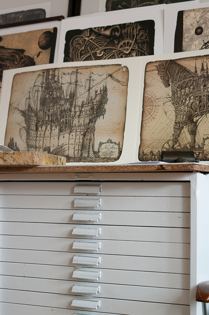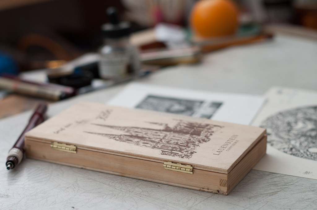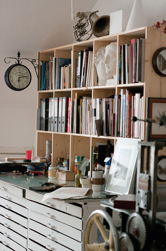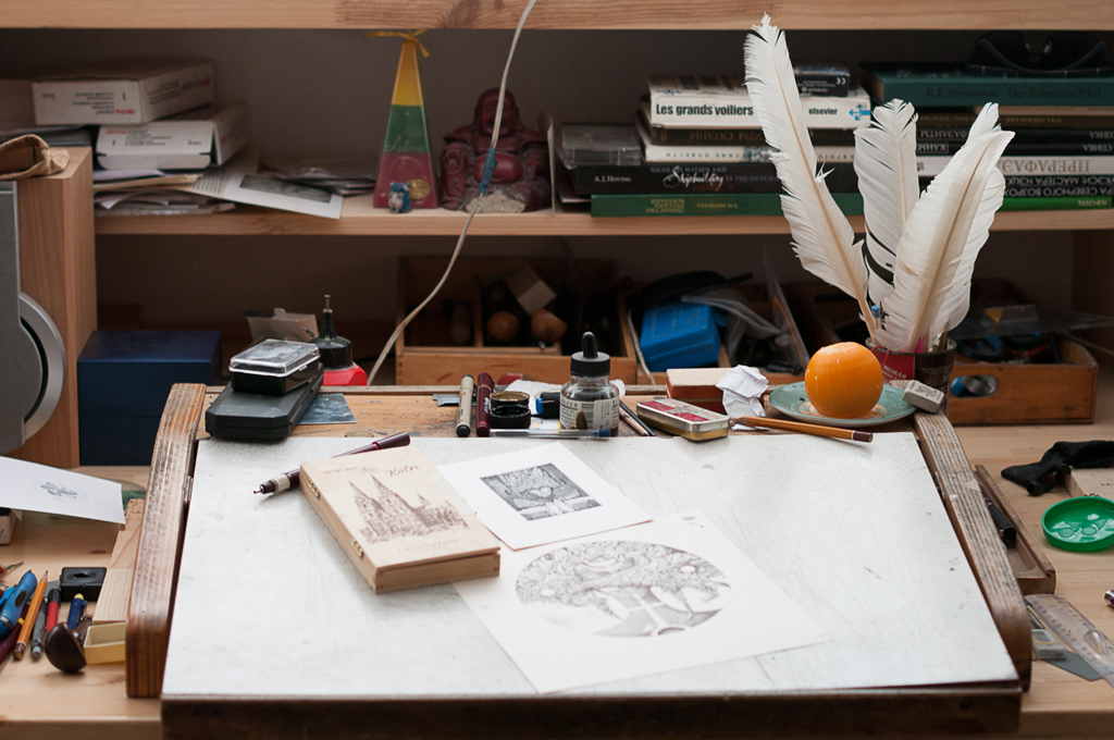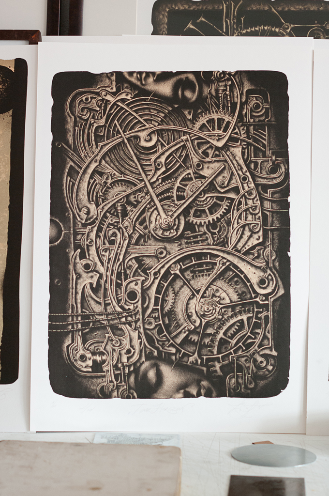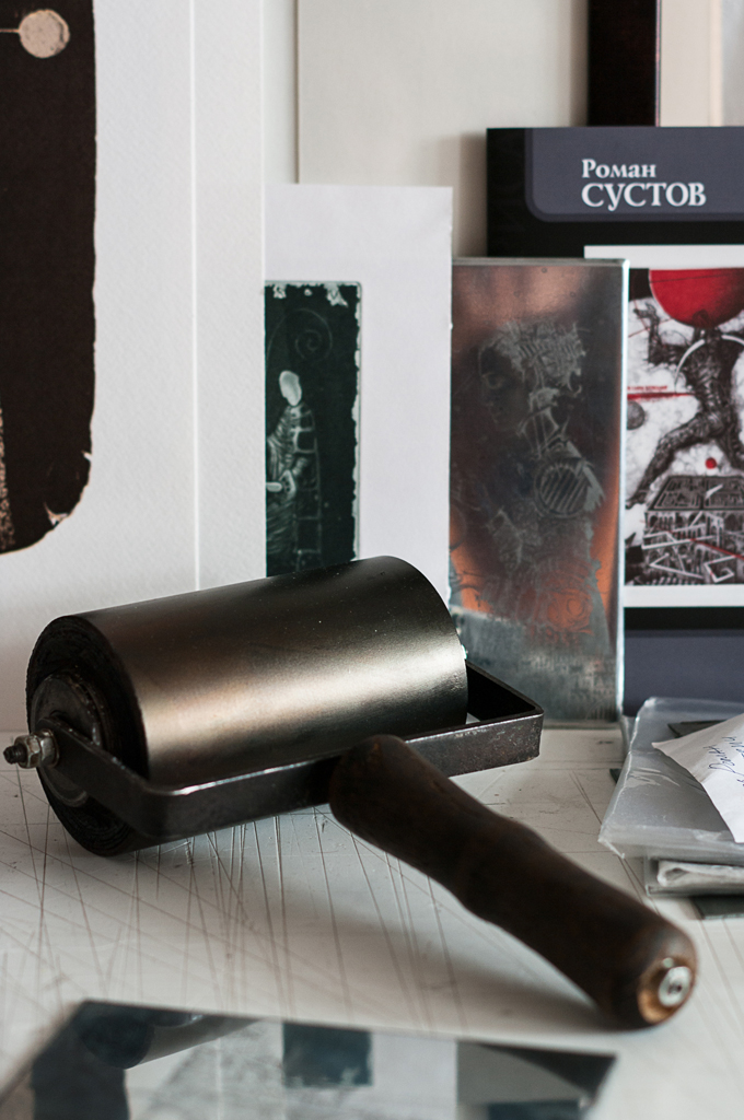 В мастерской мне не хватает тумбы для инструментов. Поэтому на столе у меня не бывает порядка, зато все необходимое под рукой. А инструментов у меня много, в том числе и самодельных. В этом плане наши художники очень предприимчивые: мы много выдумываем и сами мастерим, тогда как в европейских художественных магазинах доступно большое разнообразие уже готовых инструментов и материалов. Зато вырастает поколение, которое знает весь процесс изнутри, а художник из Европы может не знать состава краски, которой печатает.