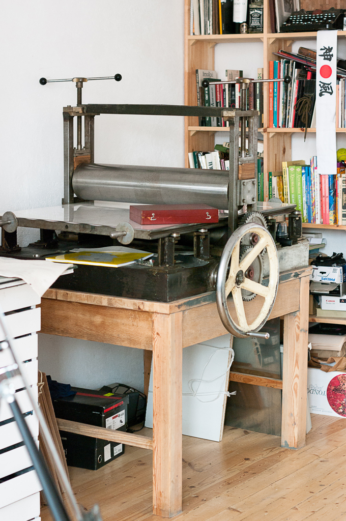 Печатаю я на уникальнейшем станке, который был сделан по проекту нашего известного мастера печатника Молоткова Дмитрия Васильевича, которому будет этой зимой 80 лет, а самому станку уже больше тридцати. Я вокруг него ходил лет шесть, просил одного нашего старого художника продать его. Деревянный стол, на котором стоит станок, тоже необычный – это прилавок послевоенного ГУМа.