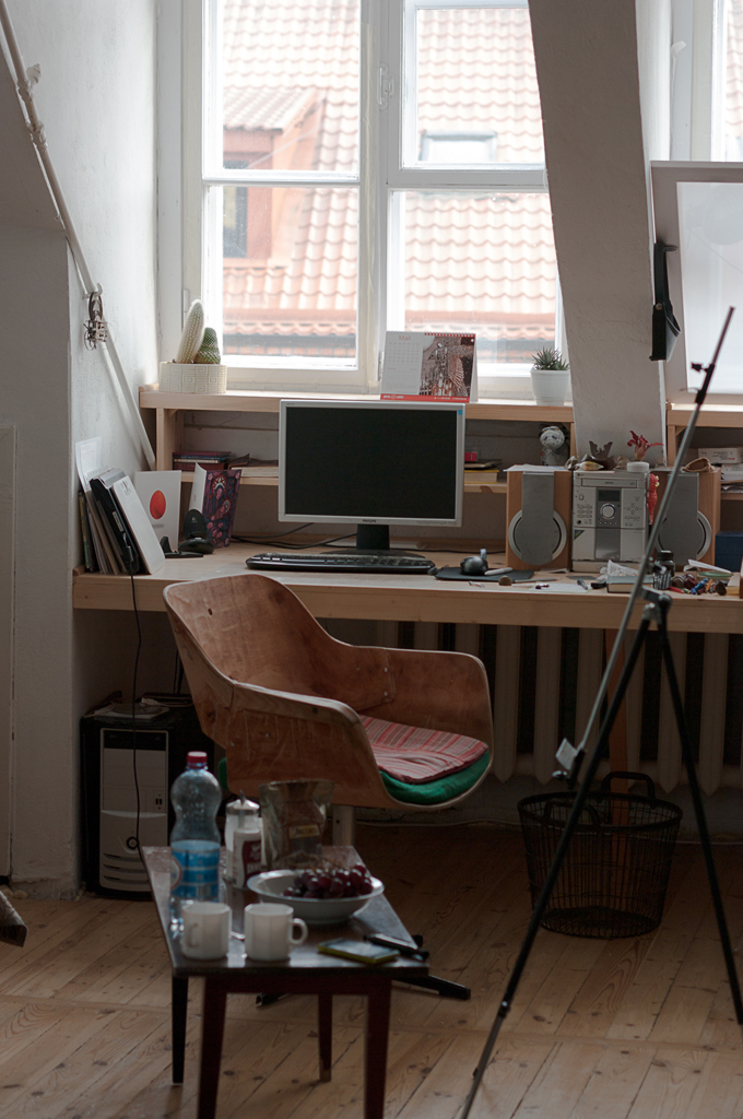 У меня всегда была мечта иметь большой стол, в этой мастерской я наконец воплотил эту мечту в жизнь. Тут у меня есть зона и для компьютера, и для графики, здесь специально установлен рассеивающий свет экран, который я сам придумал и реализовал. Можно сказать, что мне присущ перфекционизм в вопросе обустройства мастерской, но я считаю это нормальным. Не люблю работать «на коленке», мне важно, когда все удобно. Достаточно один раз все толково организовать, чтобы потом работать с комфортом.