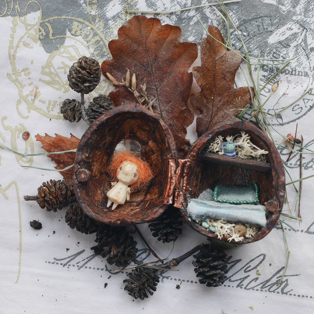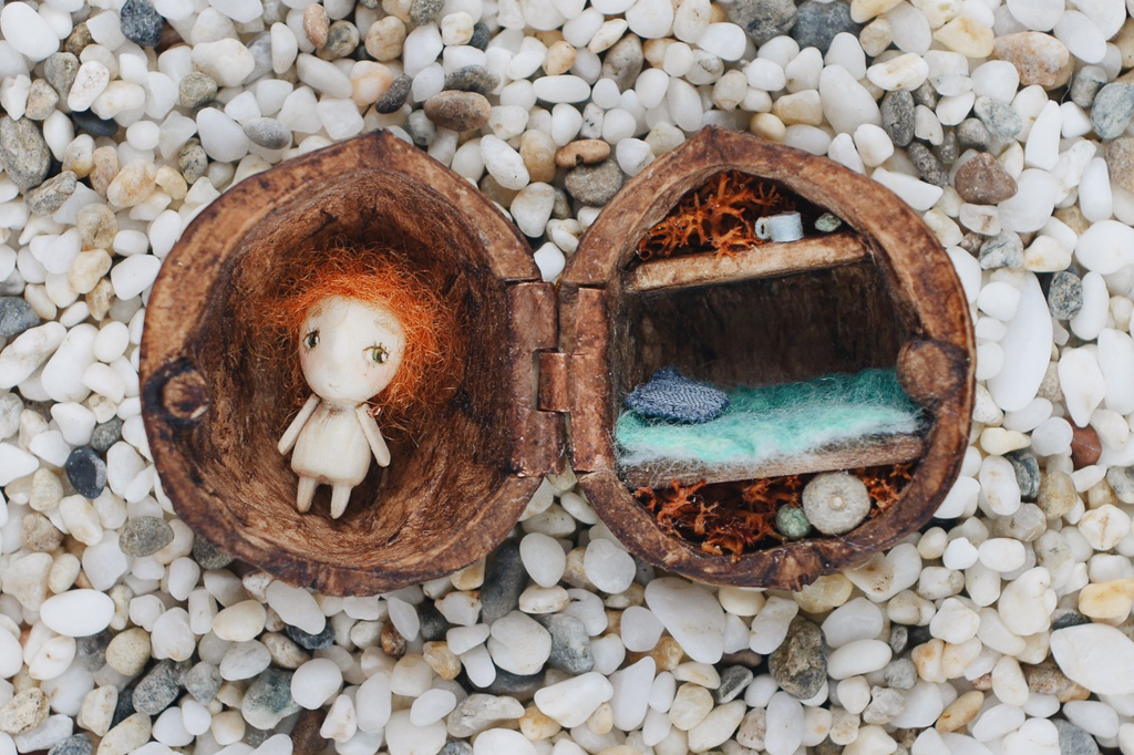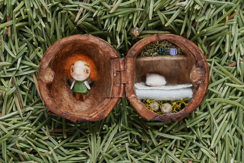 “Однажды подруга привезла мне из путешествий чудесные орехи. Они были в два раза больше обычных. Сразу захотелось кого-нибудь в них поселить! Так родилась небольшая серия кукол. Потом привезенные орехи закончились, и пришлось использовать обычные, стандартного размера. Куколки, соответственно, тоже уменьшились в два раза. И возник мир человечков, живущих в грецком орехе.