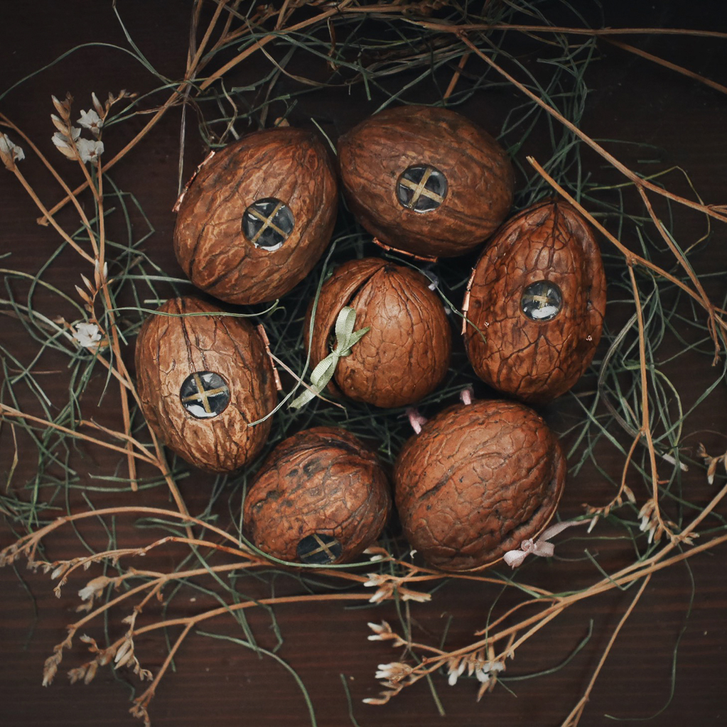 Помимо орехов я использую и другие природные материалы. Собираю буквально все, что под ногами валяется. Чаще всего эти «трофеи» использую, чтобы создать фон для фотографий, но некоторые из них идут и на изделия: мох, плоды липы, незрелые желуди.