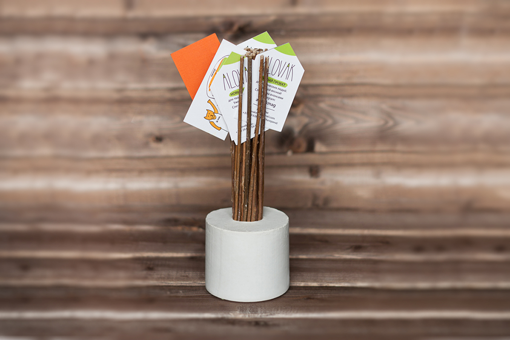 З тонкіх галінак можна зрабіць такую ??арыгінальную візітоўніцу. Для гэтага вам спатрэбяцца гіпс і форма для заліўкі, напрыклад, слоічак з-пад смятаны. Размяшайце гіпс з вадой да стану не вельмі густой смятаны, заліце ??гіпсавы раствор у форму. Галінкі звяжыце з аднаго краю і ўваткніце ў форму з гіпсам ніткамі ўніз. Улічвайце, што гіпс хутка застывае, таму дзейнічайце хутка. Пачакайце, пакуль высахне, і дастаньце візітоўніцу з формы. Галінкі зверху трэба падраўняць, а аснову з гіпсу – адшліфаваць. Пры неабходнасці такую ??візітоўніцу можна размаляваць акрылавымі фарбамі.