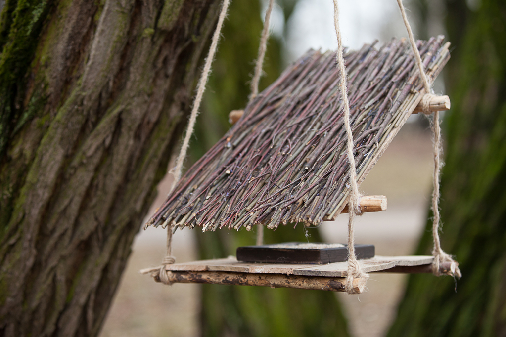 Каб зрабіць такую ??сваімі рукамі, вам спатрэбіцца некалькі дошчачак для падставы і даха, чатыры досыць тоўстыя галінкі прыдатнай даўжыні і ахапак тонкіх галінак для дэкору даху. А таксама шпагат, клей, цвічкі… У якасці «сподачка» мы выкарыстоўвалі рамку для фатаграфіі. Як зрабіць такую кармушку – шукайце пакрокавую інструкцыю тут.
