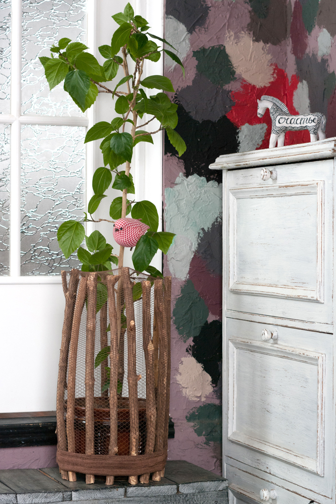 Як зберагчы любімыя расліны ад усюдыісных любімца-ката ці гарэзы-дзіцяці? Галінкі дапамогуць вам трымаць абарону! Яшчэ і дэкаратыўную функцыю выканаюць. Вы можаце выбраць самі, як замацаваць галінкі вакол гаршка: прыляпіць, прыбіць цвічкамі (калі гаршчок драўляны або пластыкавы), абматаць шпагатам. А можаце скарыстацца ідэяй ад ALOVAK: нацягнуць самую звычайную жаночую панчоху «у сетку».