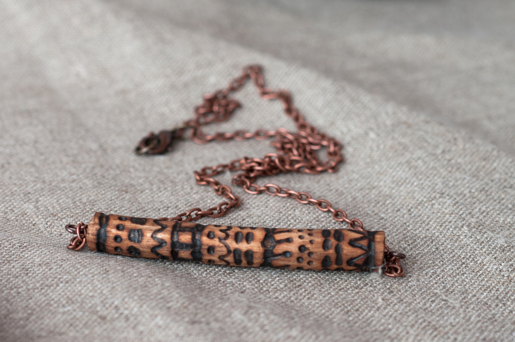 Галінкі, як і само дрэва, выдатна выглядаюць ў біжутэрыі, таму мы не маглі прайсці міма ўпрыгожванняў. Мы выбралі кулон: абрэзалі галінку да патрэбнага нам памеру, ачысцілі ад кары, выпалілі арнамент і ўставілі штыфты для ланцужка. Па аналогіі вы можаце зрабіць завушніцы, каралі, бранзалет. Нарыхтоўкі з галінак для ўпрыгожванняў можна фарбаваць, размалёўваць, выразаць – сапраўдны палёт фантазіі забяспечаны!