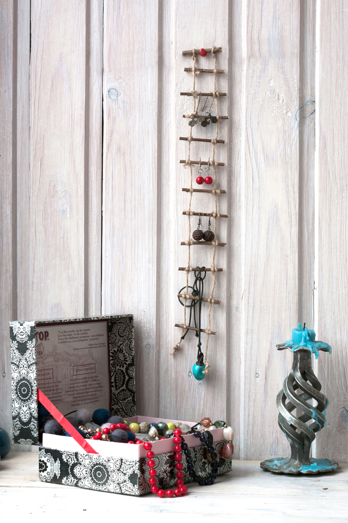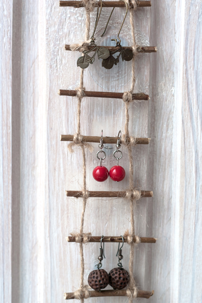 Яшчэ адна варыяцыя на тэму галінак і лесвіц. Канатная лесвічка са шпагату і галінак – выдатны спосаб захоўваць свае завушніцы, кулоны і іншую біжутэрыю.