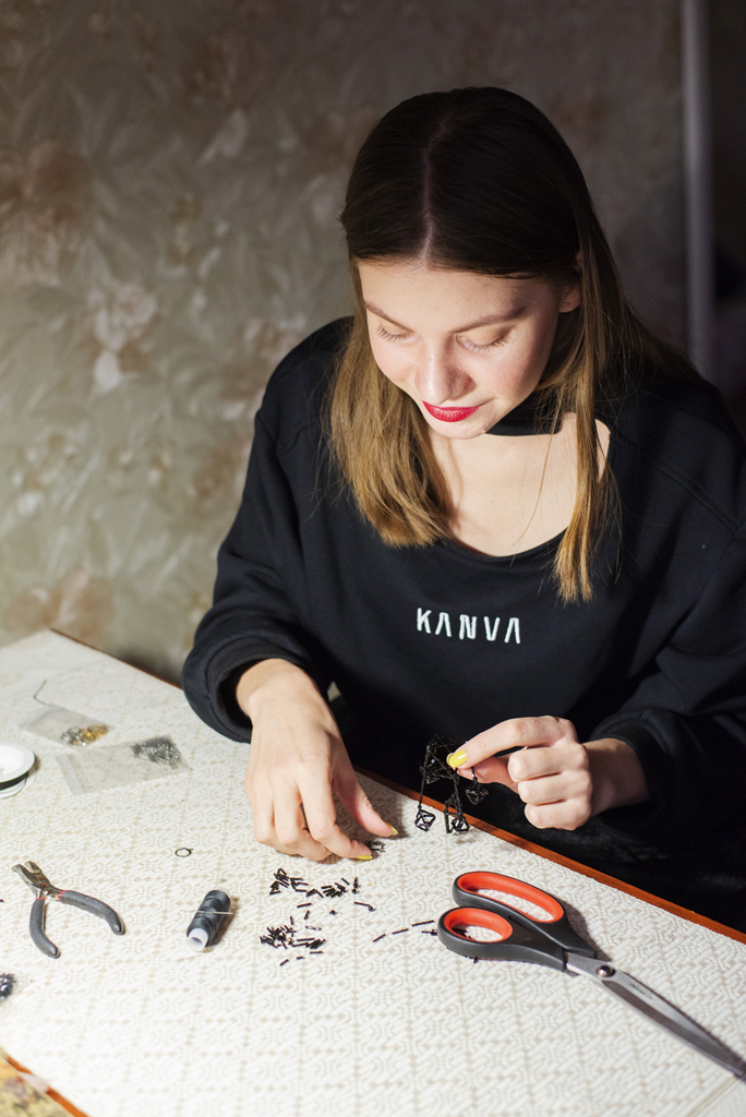 А ў малых формах я знайшла кампрамісную магчымасць і зарабіць, і выразіць сваю думку, якую я несла і ў вытворчых калекцыях на простых байках і майках, і ў складана скроеных камплектах. Упрыгожанні аказаліся больш даступнымі, чым даволі складанае ў рэалізацыі адзенне, на якое яшчэ трэба было знайсці сваю аўдыторыю. Я спадзяюся, што ўпрыгожанні для мяне – гэта прыступка да пашырэння кола прыхільнікаў брэнда, стварэння KANVA-кам’юніці. Давядзецца яшчэ сваю аўдыторыю выхаваць, самой трошкі падрасці, і ўжо на гэтай канве пачаць паказваць новыя калекцыі.